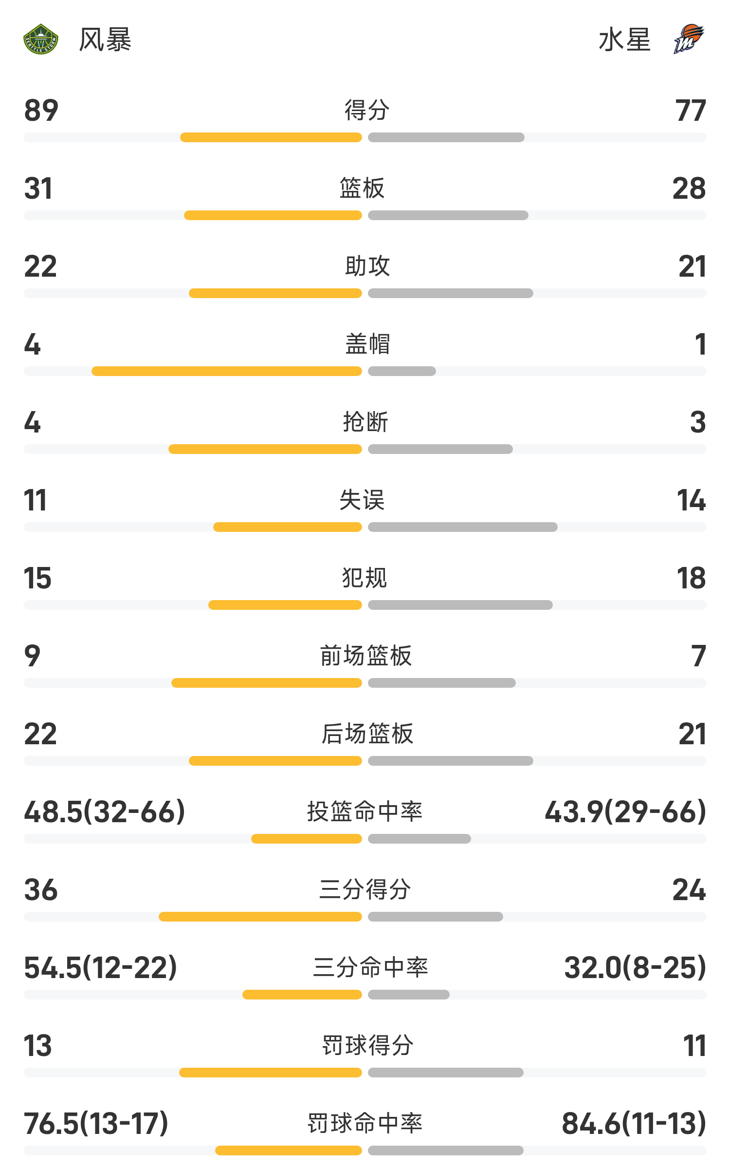 06月08日讯 25赛季WNBA 常规赛,水星对阵风暴。双方全场战罢,水星77-89不敌风暴。狄金斯砍下全场最高的26分3板7助,率领风暴成功取胜。