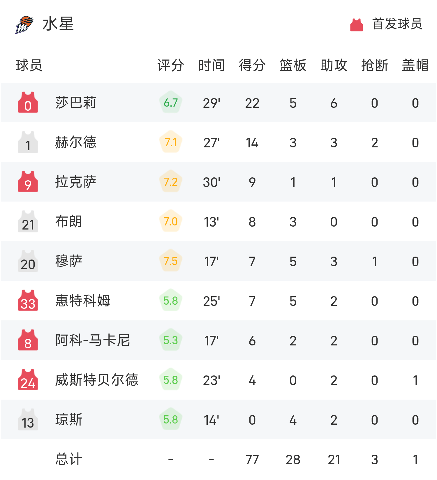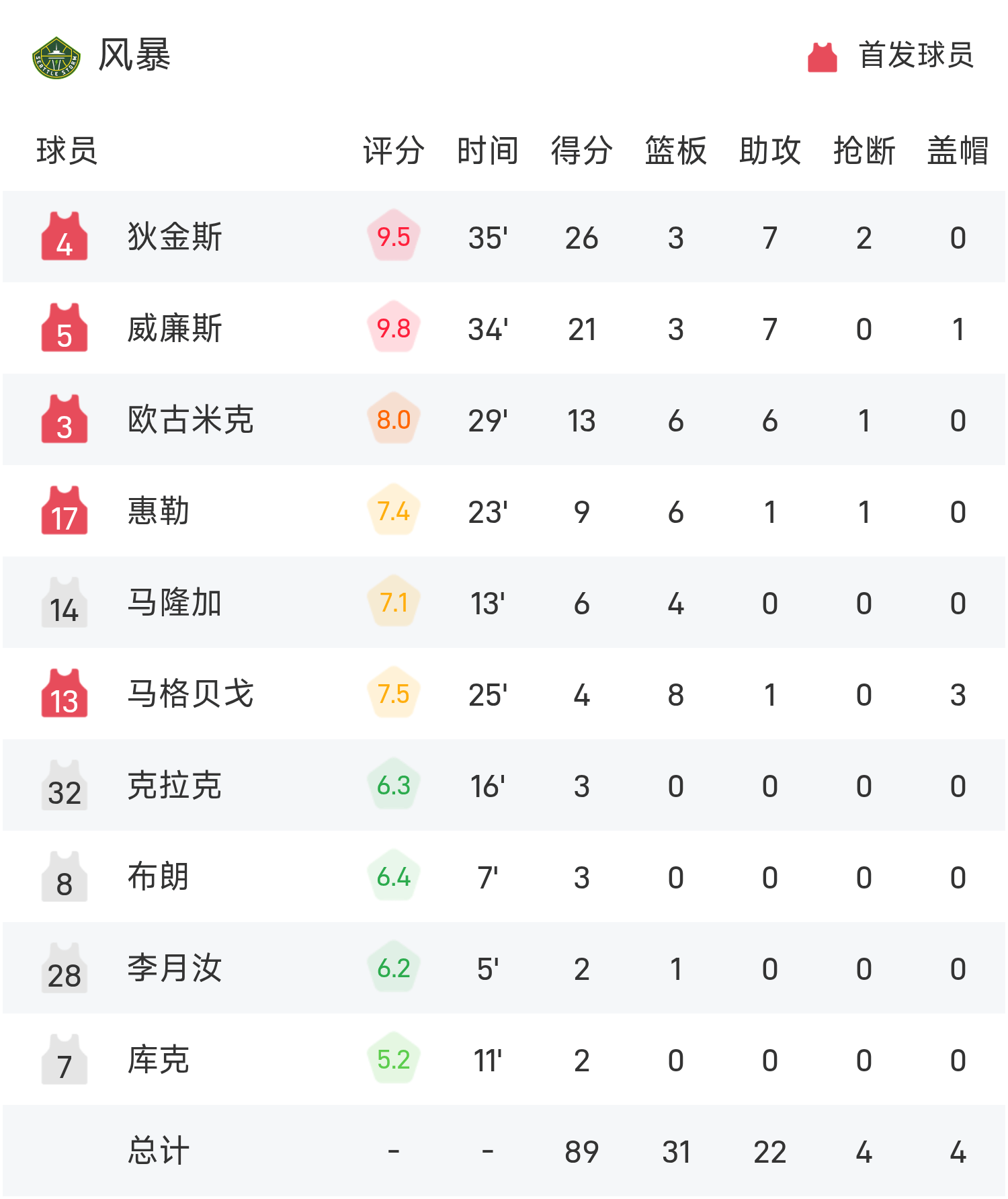 06月08日讯 25赛季WNBA 常规赛,水星对阵风暴。双方全场战罢,水星77-89不敌风暴。狄金斯砍下全场最高的26分3板7助,率领风暴成功取胜。